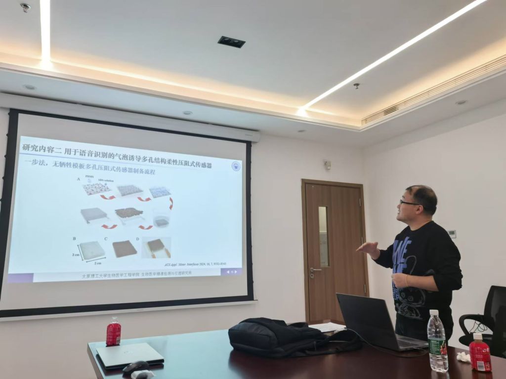 2024年11月22日下午,孟雪娟副教授和青年教师高晓光博士分别作了题为《柔性可穿戴传感器在无声语音接口中的制备及应用》和《基于二维材料的柔性电子器件及其生物医学应用》的口头报告。双方进行了细致讨论,并明确进一步合作事宜。