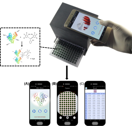 李晓春教授课题组将ELISA分析技术与智能手机相结合,首次采用大孔径聚焦透镜实现了手机对96微孔板的全范围准确成像,开发了微型ELISA分析仪,真正实现了“掌上”医疗检测。目前,该仪器已经公开国家发明专利一项,授权实用新型专利、外观专利各一项,获得软件著作权一项。此外,该项技术正在与多家企业进行洽谈,期待早日推广到市场,服务于人民的医疗健康行业。
