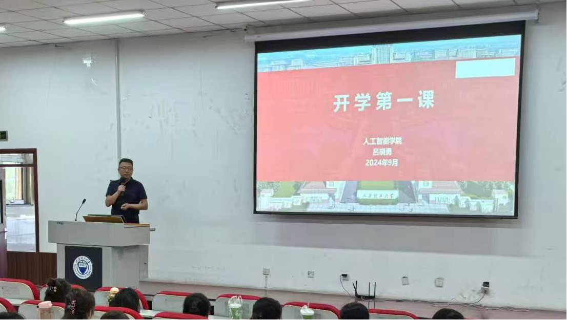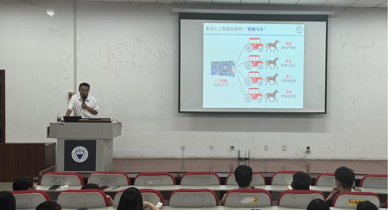院长魏明强介绍学院的学科概况、发展历程和师资队伍等,并以人工智能的发展为切入点,阐述了人工智能与各个学科的融合与交叉,让同学们更加清晰地认识到AI赋能的重要性,明确了未来的学习方向。