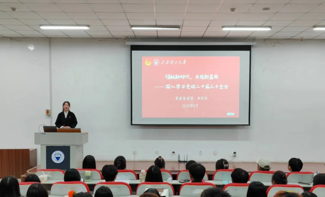 校青春宣讲团李秋彤同学以“领航新时代,共绘新蓝图”为主题,她表明党的二十届三中全会提出教育、科技、人才是中国式现代化的基础性、战略性支撑,而青年兴则国家兴,因此我们应该以“功成不必在我,功成必定有我”为担当己任,推进强国建设、民族复兴。