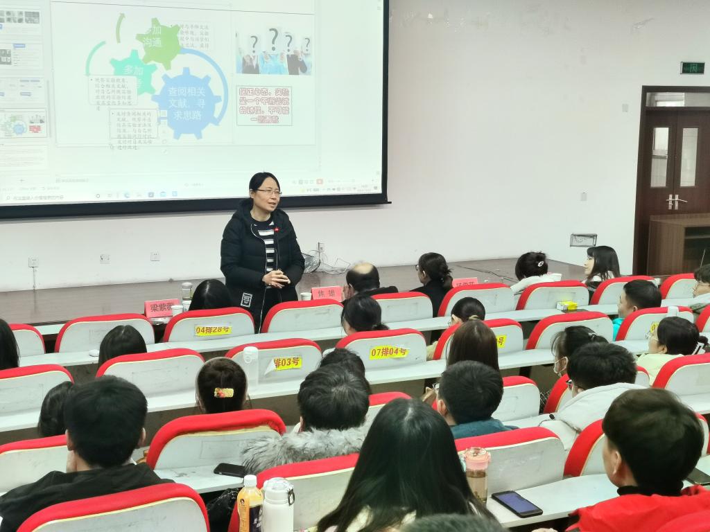 六位国奖获得者杨莎莎、张秀梅、马玉兰、李文慧、丁惠秀、朱煜华分别就个人简介、科研规划、成果介绍、成长感悟四部分进行分享。杨莎莎同学认为科技创新是滴水穿石的过程,要以积极向上的心态坚持不懈地努力,才能有所收获。张秀梅同学与大家分享了“如何确立课题”、“如何设计实验”、“如何总结研究成果”等同学们较为关心的问题。马玉兰同学提到了阅读文献的必要性与重要性,并分享了一些检索和阅读文献的工具以及论文写作的技巧。李文慧同学详细介绍了自己的研究方向以及课题组近期取得的成果。丁惠秀同学总结了几种文献检索方法。朱煜华同学展示了丰富多彩课余生活,分享了自己保持科研热情的秘诀。