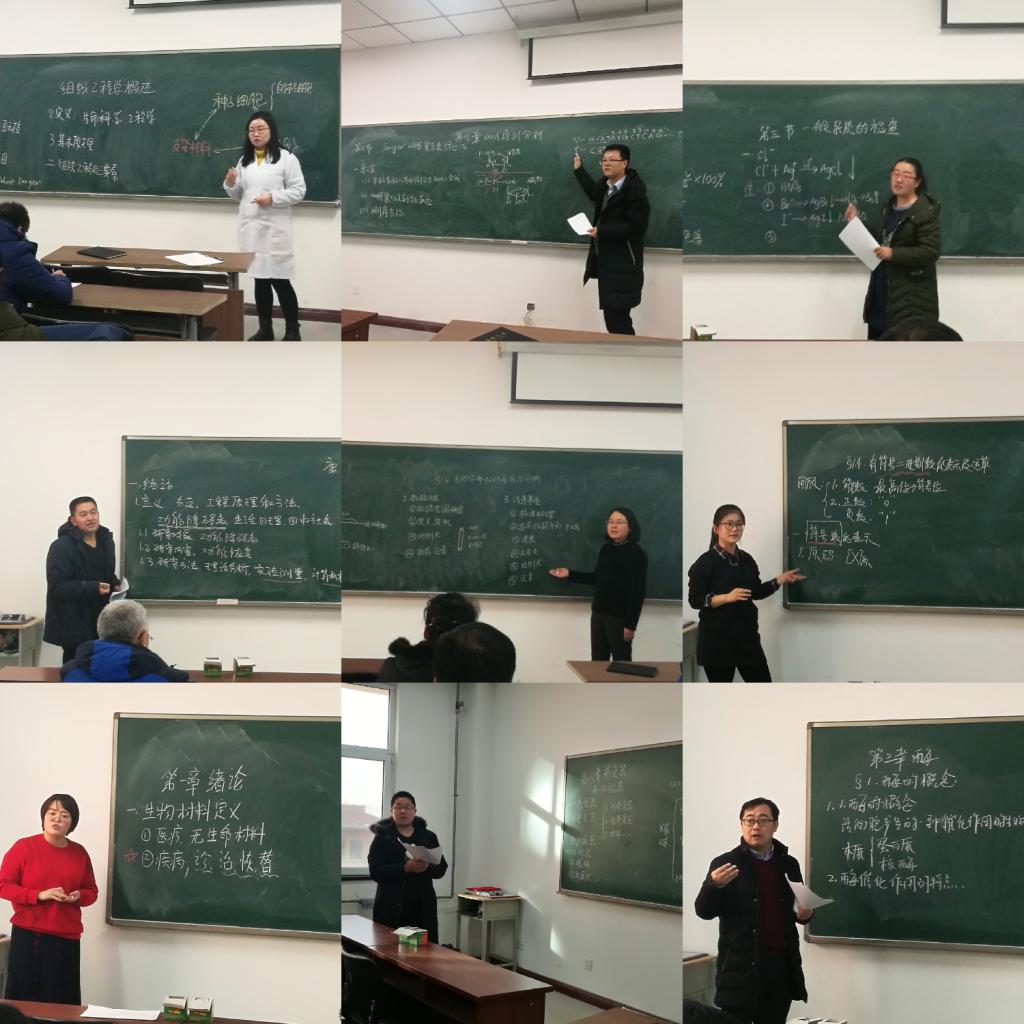 此次试讲评委成员有:院长陈维毅、副院长贾月梅、副院长安美文、制药系主任常宏宏、生医系副主任武晓刚、以及资深教师李彦威。试讲教师均采用全板书形式,评委针对每位教师在讲课过程中:精神面貌,授课内容,讲课逻辑性,重点、难点的把握,板书设计,字体大小,以及容易出现的习惯性动作等问题进行了点评,并给予合理化的指导意见。开新课教师就各自教学过程中出现的问题和经验,进行了积极交流,收获颇丰。