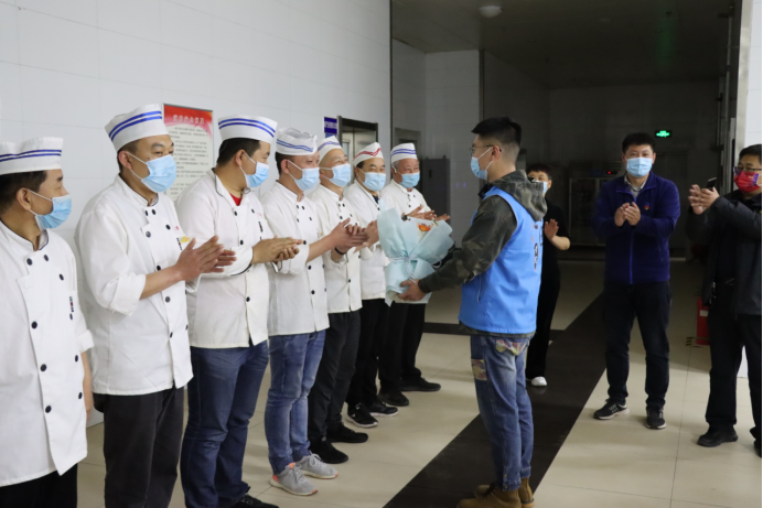 “民以食为天”,食品质量安全是他们不变的追求,特色菜品美味鲜香。每一份交到师生手中的餐食,都凝结着他们的汗水。疫情侵袭,物资运输受阻,他们挺身而出,为饮食保驾护航。接到同学们的鲜花,他们的脸上满满笑意。