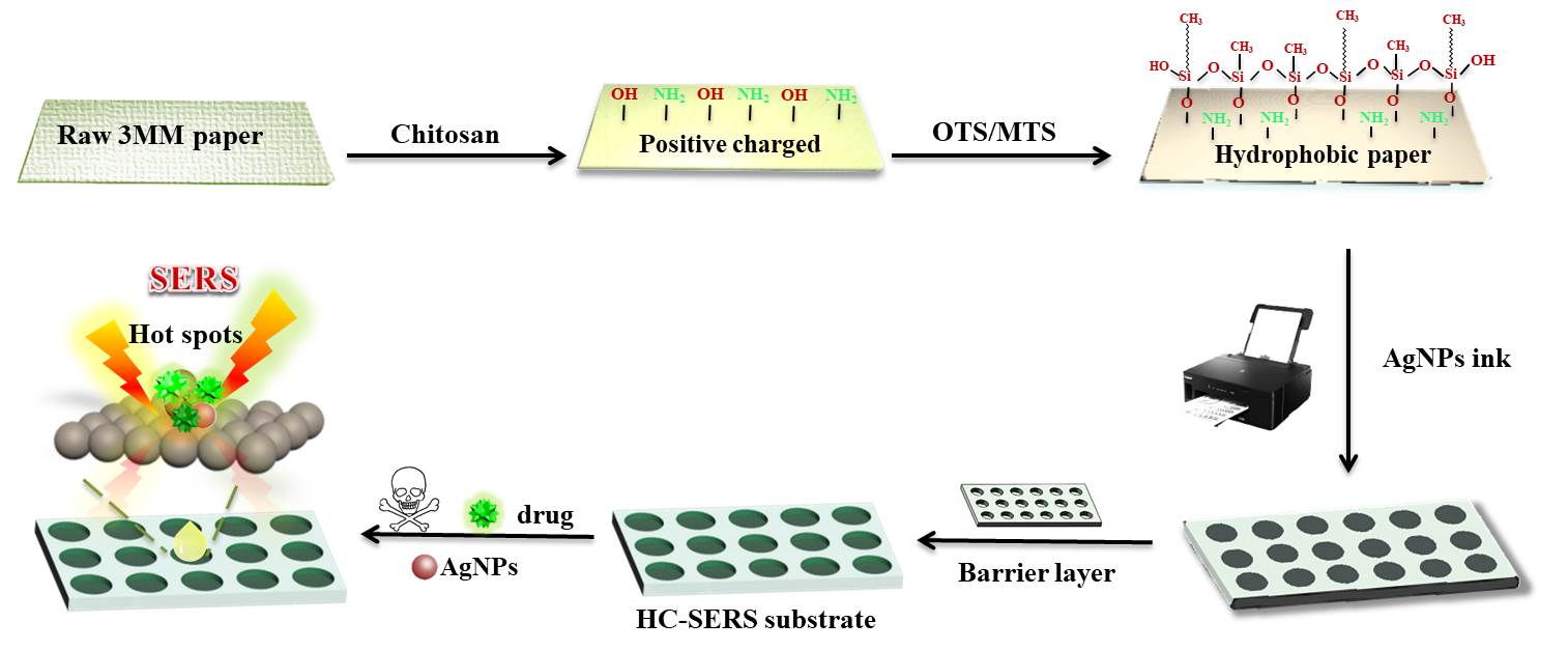 毒品滥用严重威胁着人类的生命健康和公共安全,已成为全球共同关注的问题。开展毒品的快速、准确检测分析对于精准打击毒品犯罪有着重要意义。表面增强拉曼散射(Surface enhanced Raman scattering,SERS)技术因可提供分子详细的指纹信息被广泛应用于毒品、毒物的鉴定与检测。然而,受SERS基底重现性和稳定性的影响,SERS技术仍难以全面用于毒品的现场检测分析。在本研究中,为了显著提高纸质SERS基底的性能,首先利用壳聚糖和疏水试剂对滤纸表面进行改性修饰。壳聚糖的加入一方面有效填充了滤纸纤维素之间的孔隙,提高纸基表面的均匀性。另一方面,由于壳聚糖分子中含有大量的氨基,使得滤纸表面带有正电性,有助于负电性银纳米粒子的沉积。经疏水试剂进一步处理后,纸基表面具有优异的疏水性,可以有效富集待测分子,提高其检测灵敏度。随后,结合喷墨打印技术,通过自定义设计阵列式图案并将银纳米粒子均匀打印在上述改性的纸基表面,即可成功制备高通量SERS活性基底。该SERS平台制备成本低、流程简单且易携带,为违禁药物的现场快速检测提供一种新的方案。